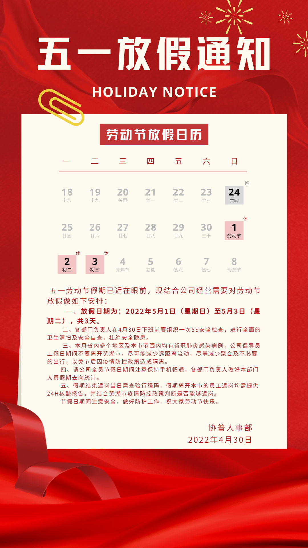 同時(shí),也希望大家在享受“五一”假期的同時(shí),做好個(gè)人防護(hù),注意自身安全,過一個(gè)平安的勞動(dòng)節(jié)!